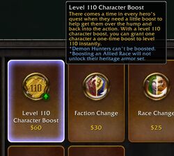 Class Deed Tome. For tankhealer Id suggest not boosting if you havent played them before past level 100-ish. I would hold on to your class boost and just play one of your current 110s. I know that it may be personal matter but there might be some consensus. Basically got one of every class at 110 thanks to leveling through invasions. - World Of Warcraft Battle For Azeroth Guide by thebluecrusader. Secondly once you have a character at level 70 you can then create a Demon Hunter these will be lvl 100 by the time you leave the starting zone and its very easy to level through Legion using invasions and whatnot. Best Class to Boost to 110. And I plan to play other classes too.