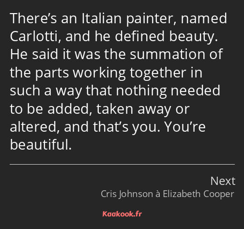 An Italian painter named Carlotti defined beauty as the summation of the parts working together in such a way that nothing needed to be added taken away or altered.